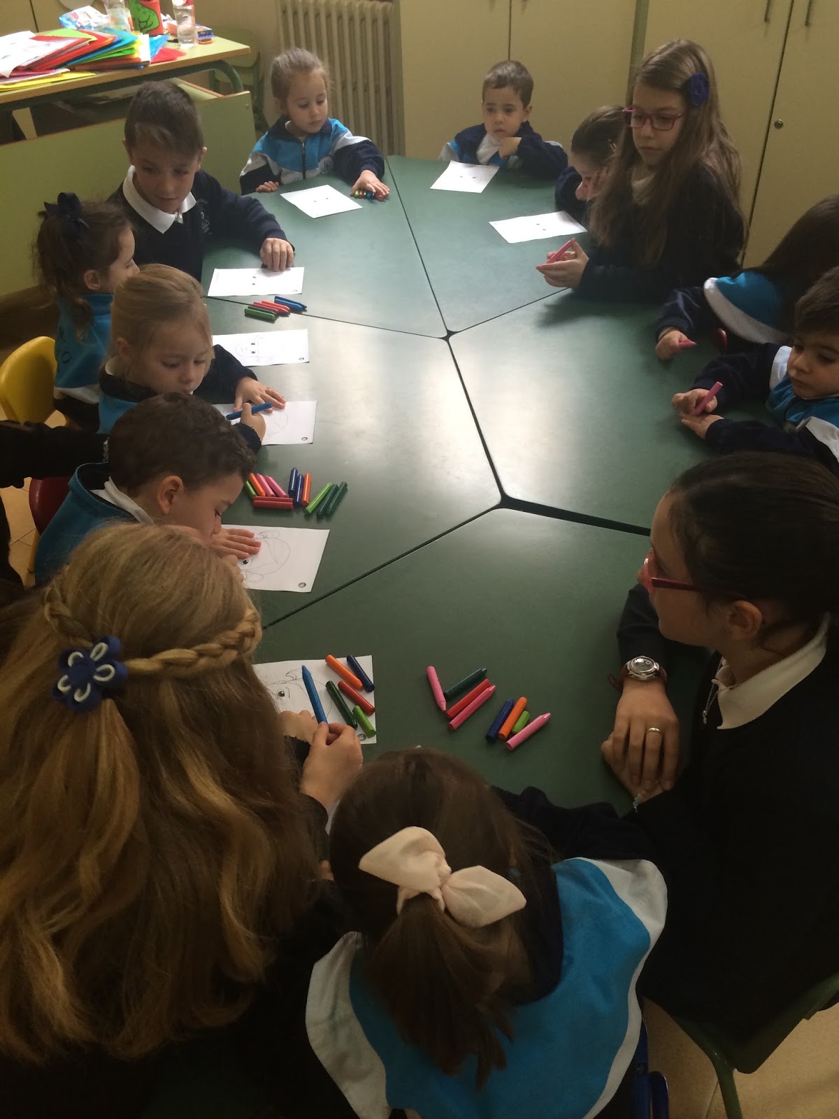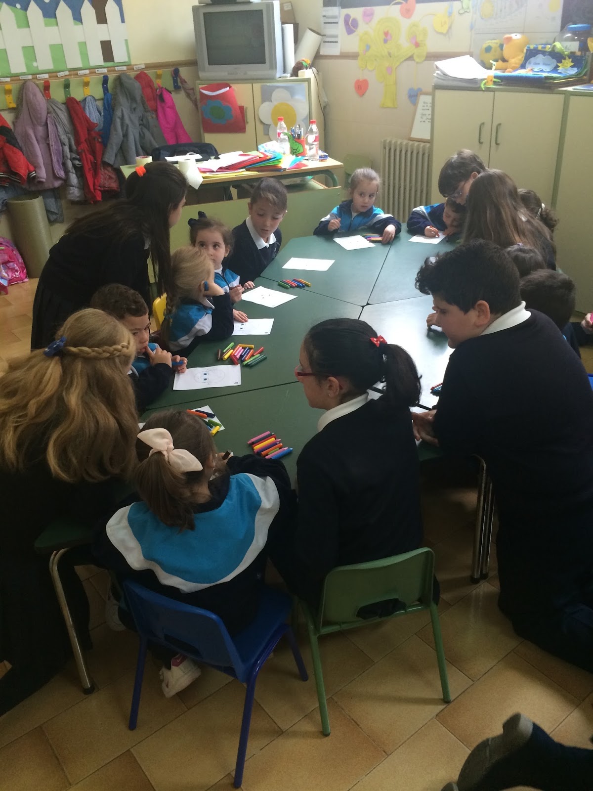 Ayer tuvimos la segunda sesión de learning together entre estudiantes de 1º de infantil y estudiantes de 4º de primaria. Se les dio a los pequeños una fotocopia con una imagen de una cara, los mayores tenían que decirles cómo colorear las partes de la cara, así que estuvieron repasando los colores y las partes de la cara al mismo tiempo. Los mayores tenían muchas ganas de ver a los pequeños de nuevo. !Se lo pasaron genial!
